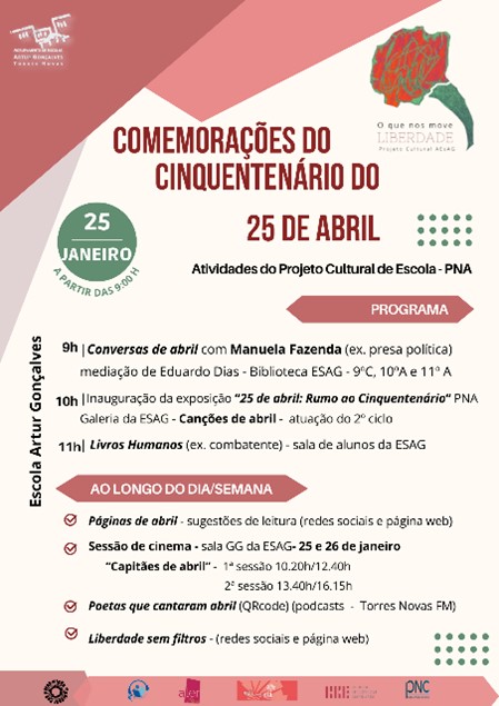 O AE Artur Gonçalves comemora, de 25 de janeiro a 25 de junho, o cinquentenário do 25 de abril, com múltiplas atividades integradas no seu Projeto Cultural de Escola.